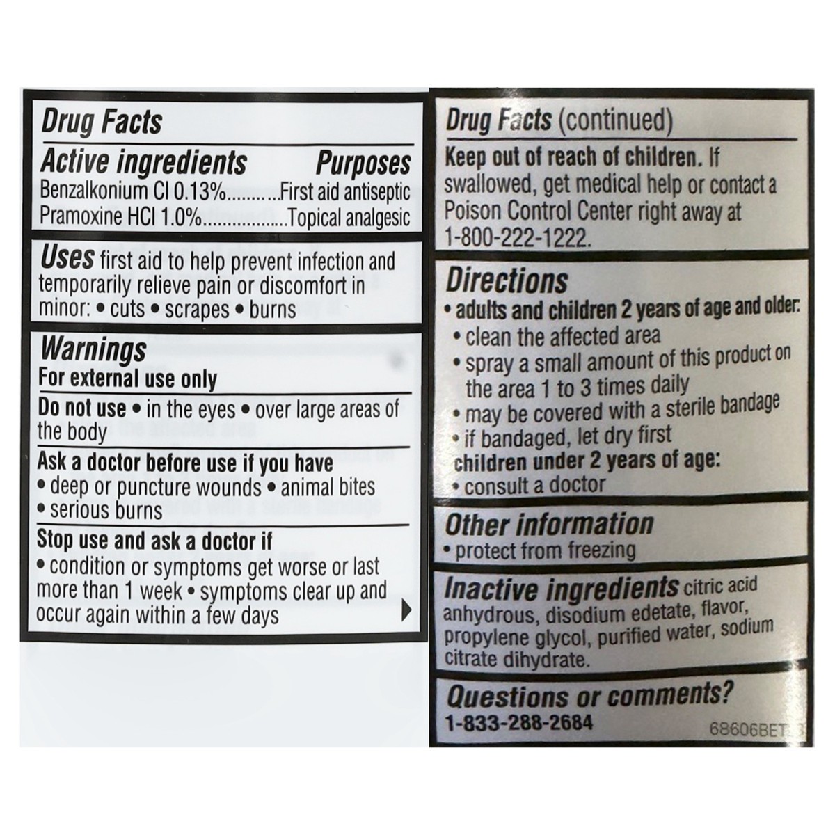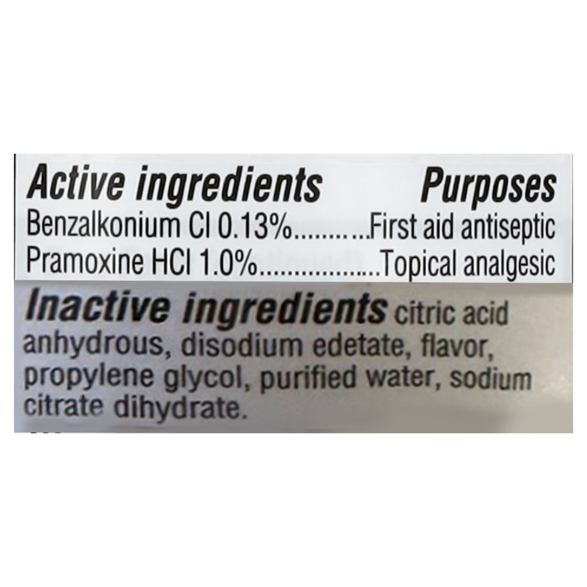 Active Ingredients: Benzalkonium CI (0.13 %), First Aid Antiseptic; Pramoxine HCI (1.0 %), Topical Analgesic. Inactive Ingredients: Citric Acid, Anhydrous, Disodium Edetate, Flavor, Propylene Glycol, …