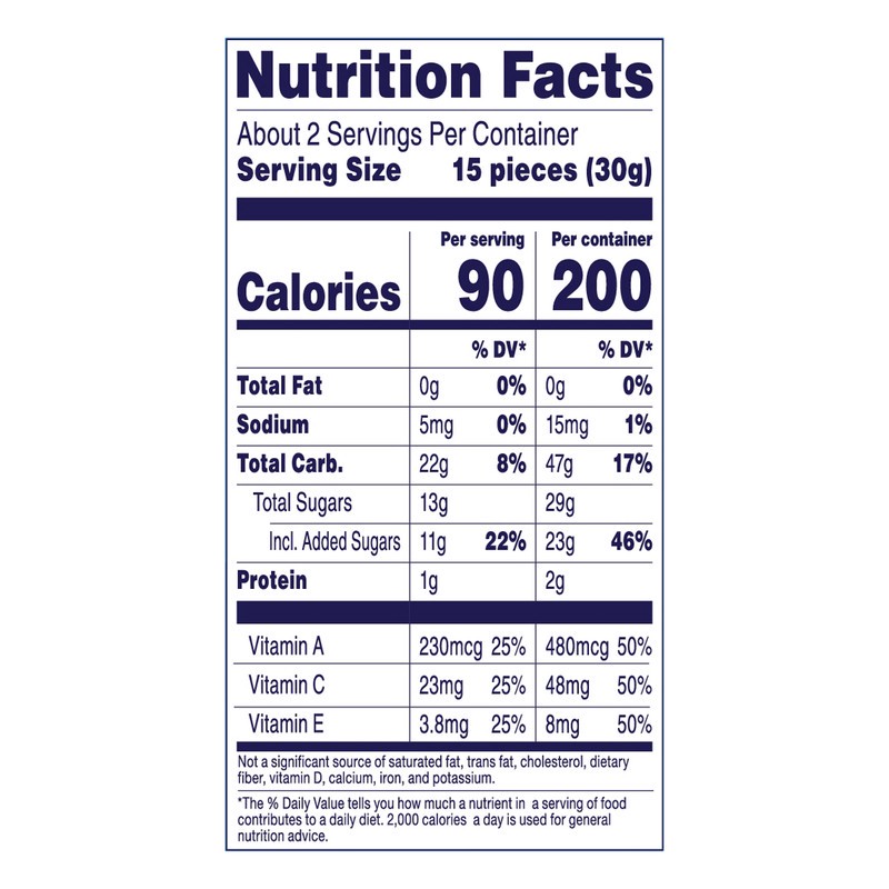 Natural & artificial flavors. Per Serving: 90 calories; 0 g sat fat (0% DV); 5 mg sodium (0% DV); 13 g sugars. Gluten free. Excellent source of vitamins A, C & E. Family farmer owned. Colors from natu…