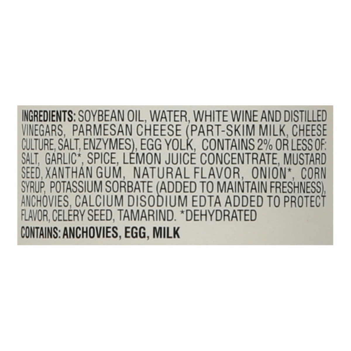 Soybean Oil, Water, White Wine and Distilled Vinegars, Parmesan Cheese (Part-Skim Milk, Cheese Culture, Salt, Enzymes), Egg Yolk, Contains 2% or Less of: Salt, Garlic (Dehydrated), Spice, Lemon Juice …