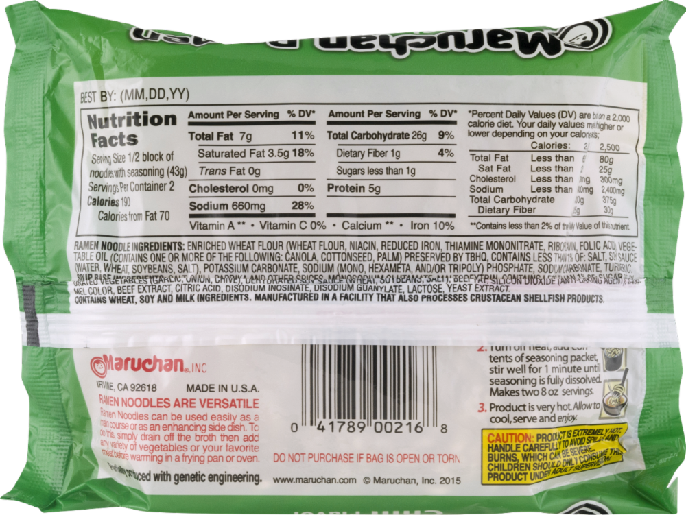 Ramen Noodle Ingredients : Enriched Wheat Flour ( Wheat Flour , Niacin , Reduced Iron , Thiamine Mononitrate , Riboflavin , Folic Acid ) , Vegetable Oil ( Contains : One Or More Of : The Following : C…