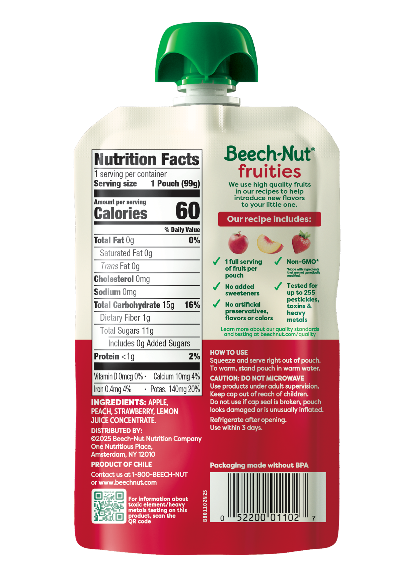 From about 6 months. Non GMO Project verified. nongmoproject.com. Nothing artificial added. 1/4 apple. 1/5 peach. 1-1/2 strawberries. www.beechnut.com. Contact us at 1-800-Beech-Nut or www.beechnut.co…