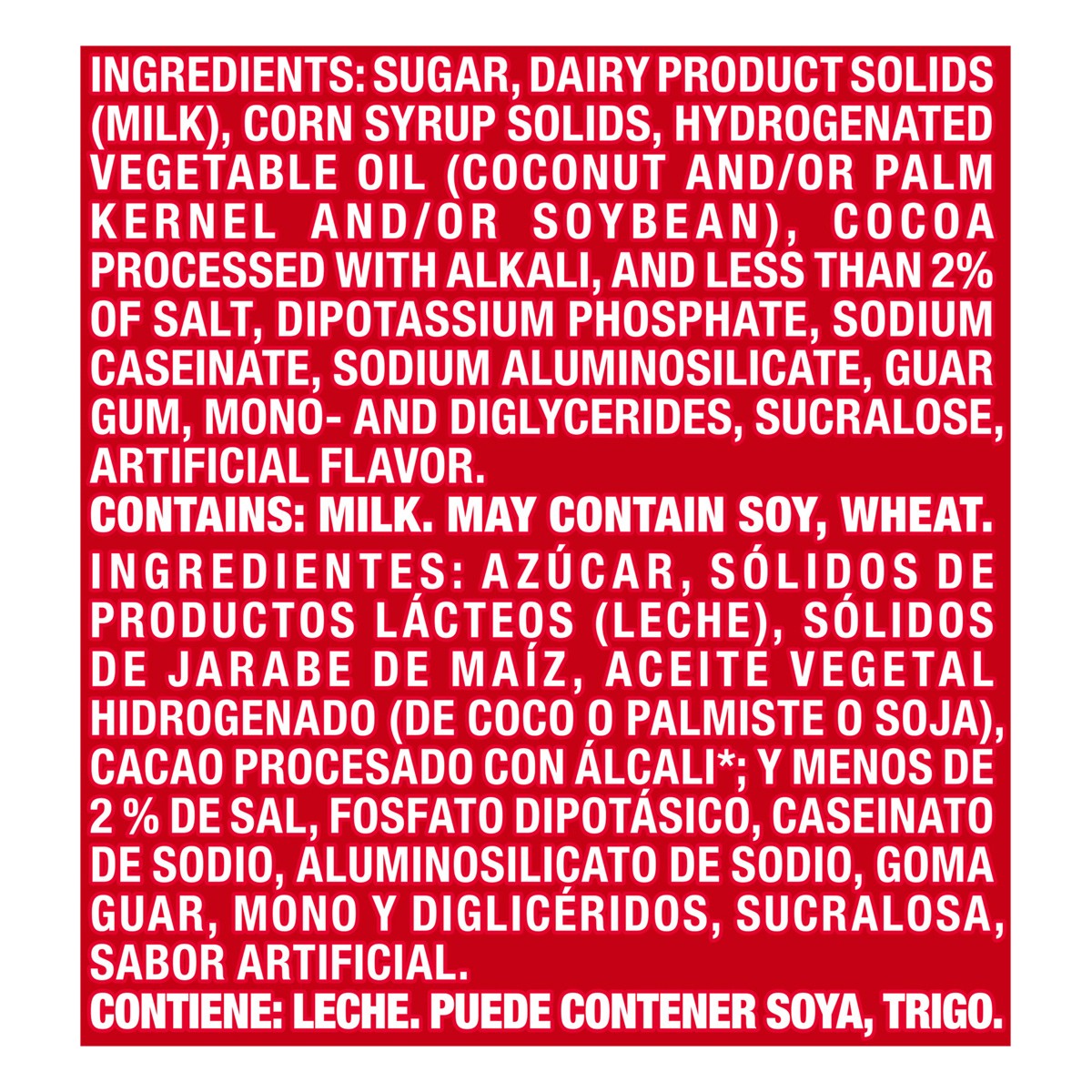 Sugar, Dairy Product Solids (Milk), Corn Syrup Solids, Hydrogenated Vegetable Oil (Coconut and/or Palm Kernel and/or Soybean), Cocoa Processed with Alkali, and Less than 2% of Salt, Dipotassium Phosph…