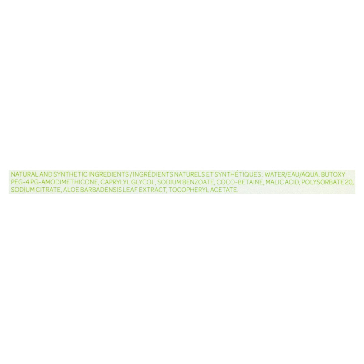 Natural and Synthetic Ingredients: Water/Eau/Aqua, Butoxy PEG-4 PG-Amodimethicone, Caprylyl Glycol, Sodium Benzoate, Coco-Betaine, Malic Acid, Polysorbate 20, Sodium Citrate, Aloe Barbadensis Leaf Ext…