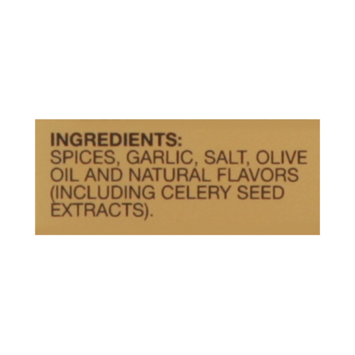 Spices, Garlic, Salt, Olive Oil and Natural Flavors (Including Celery Seed Extracts).