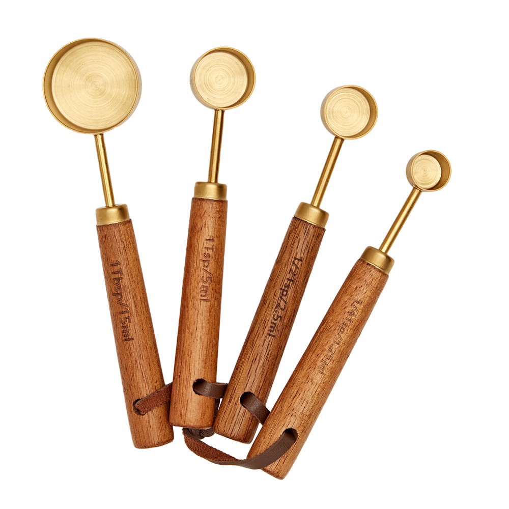 This 4-piece Acacia & Brass Measuring Spoon Set from SDS for HD Designs makes it easy to measure out ingredients for any recipe you choose. Made from stainless steel in a brass hue, these measuring sp…