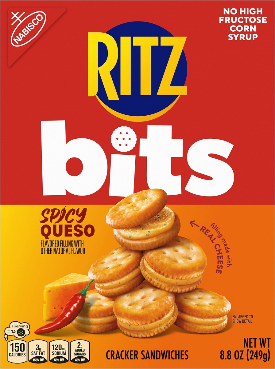 Enjoy a spicy twist on the classic RITZ Bits cheese cracker sandwiches you know and love with RITZ Bits Spicy Queso Cheese Sandwich Crackers. The bite-sized snacks layer a delicious, spicy cheese spre…