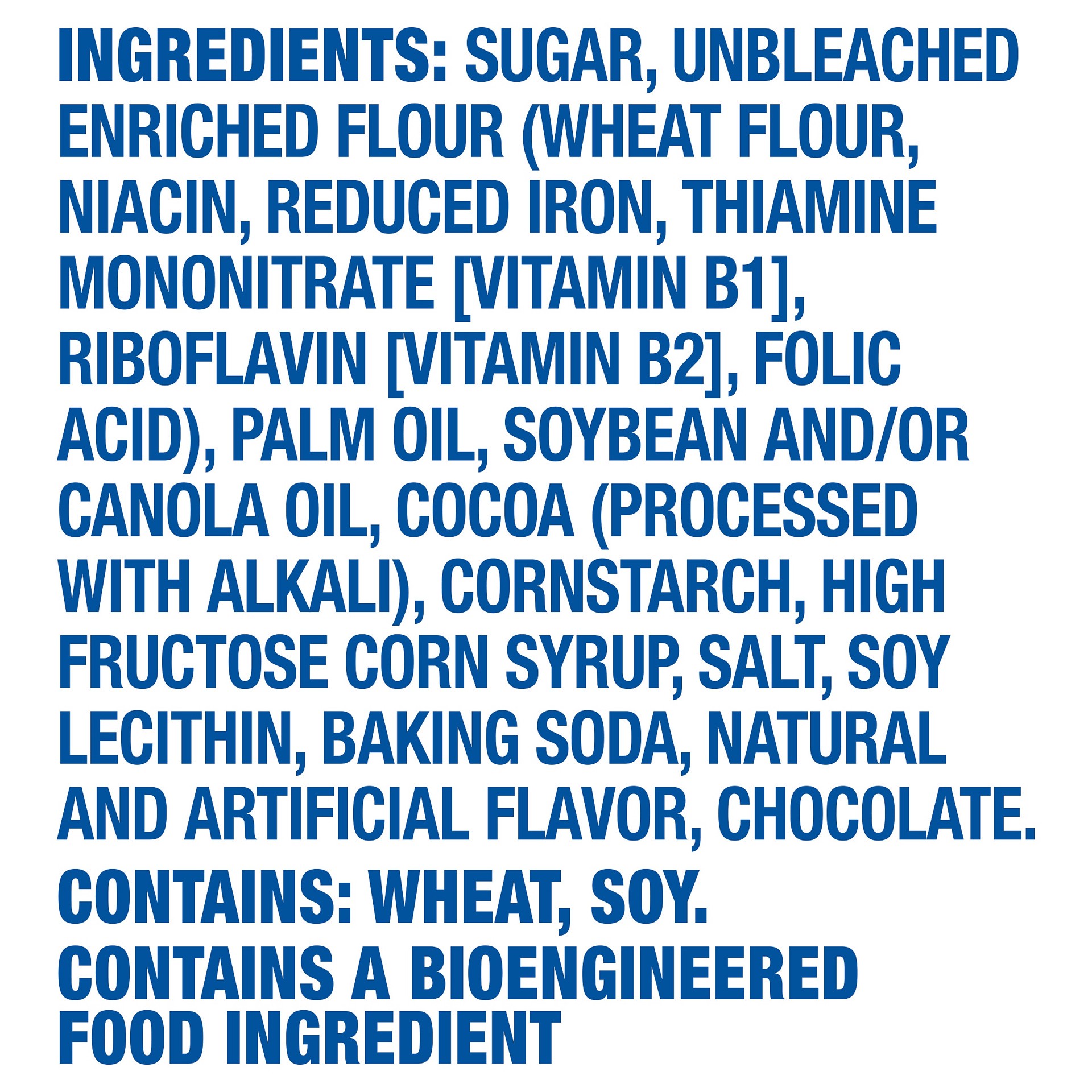 INGREDIENTS: SUGAR, UNBLEACHED ENRICHED FLOUR (WHEAT FLOUR, NIACIN, REDUCED IRON, THIAMINE MONONITRATE [VITAMIN B1], RIBOFLAVIN [VITAMIN B2], FOLIC ACID), PALM OIL, SOYBEAN AND/OR CANOLA OIL, COCOA (P…