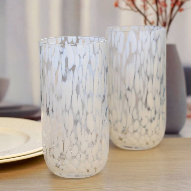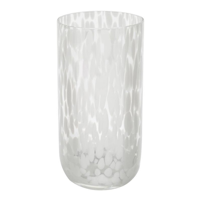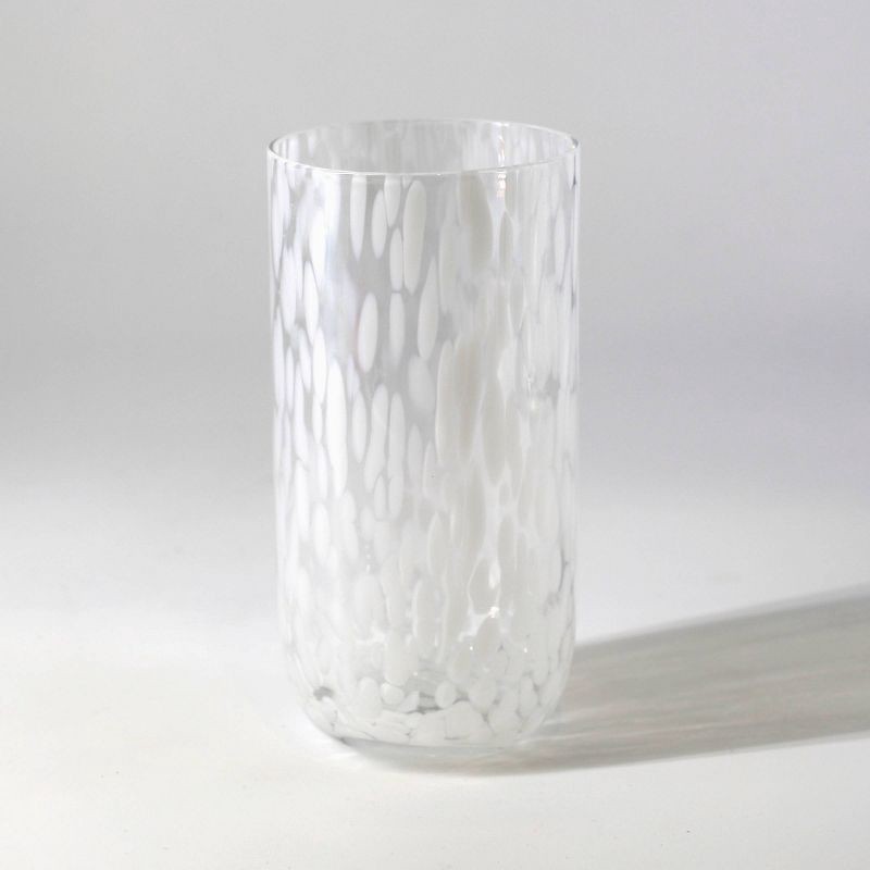This highball drinking glass decorated with white speckles. Its tall shape gives it a contemporary, elegant feel, making it suitable for both everyday use or to add to a lovely table setting. The scat…