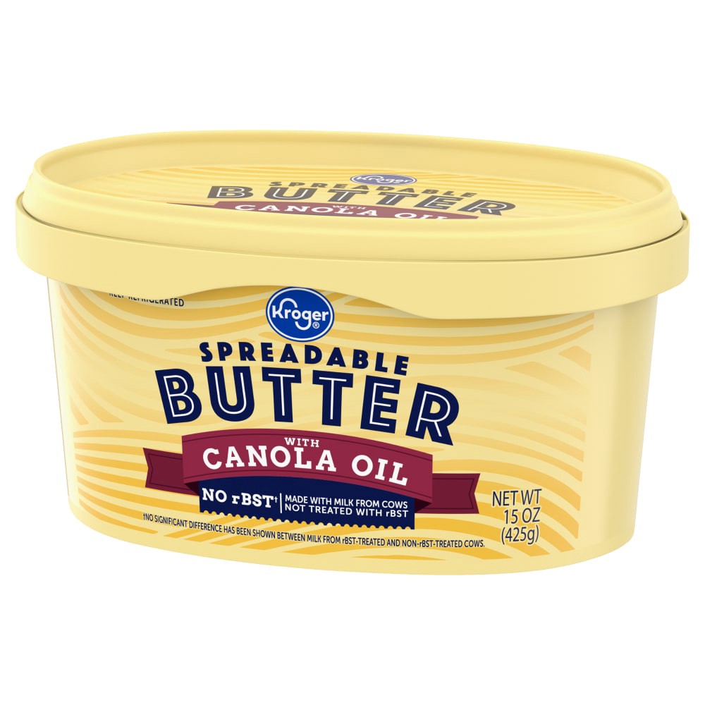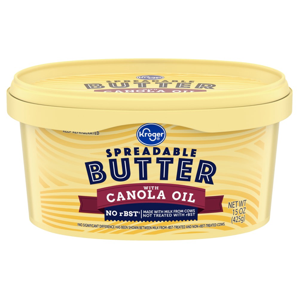Kroger® Spreadable Butter With Canola Oil melts into mouthwatering magic on any dish! Containing **pasteurized cream**, **canola oil**, and **sea salt**, its creamy delight transforms toast, pasta, an…