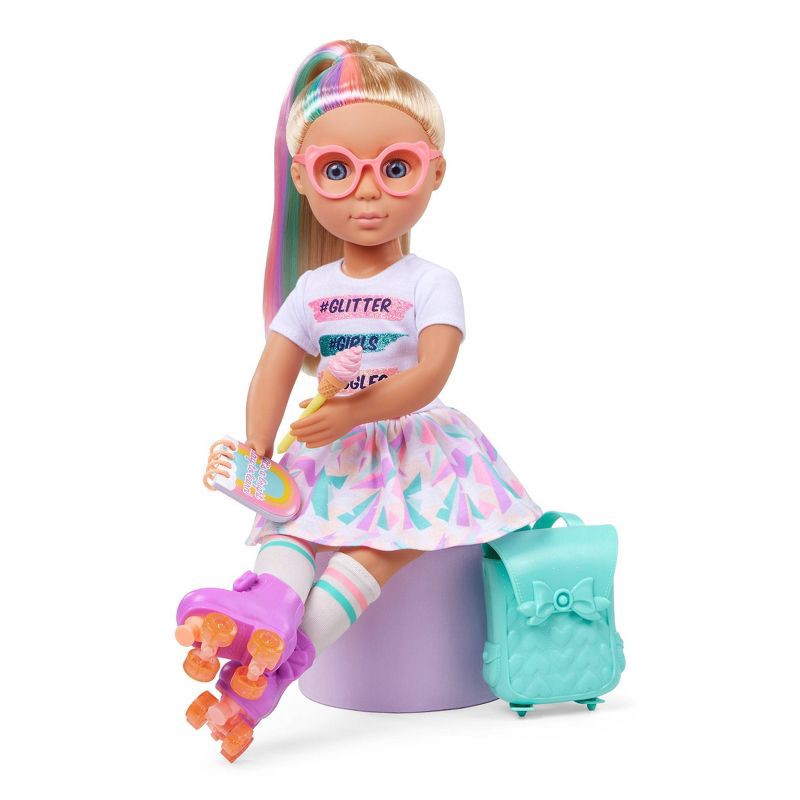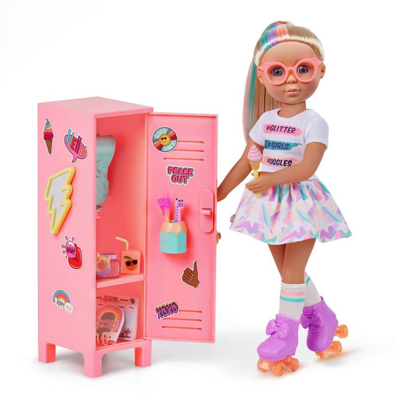 Roll into schoolyard magic with the Marlo & GG School Locker Playset! Marlo is a fully poseable, 14-inch doll with bright turquoise eyes and long blond hair with a multicolored streak that's silky-sof…