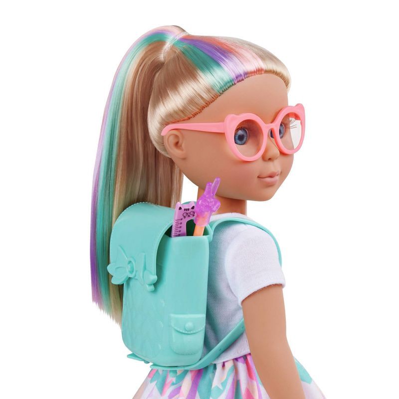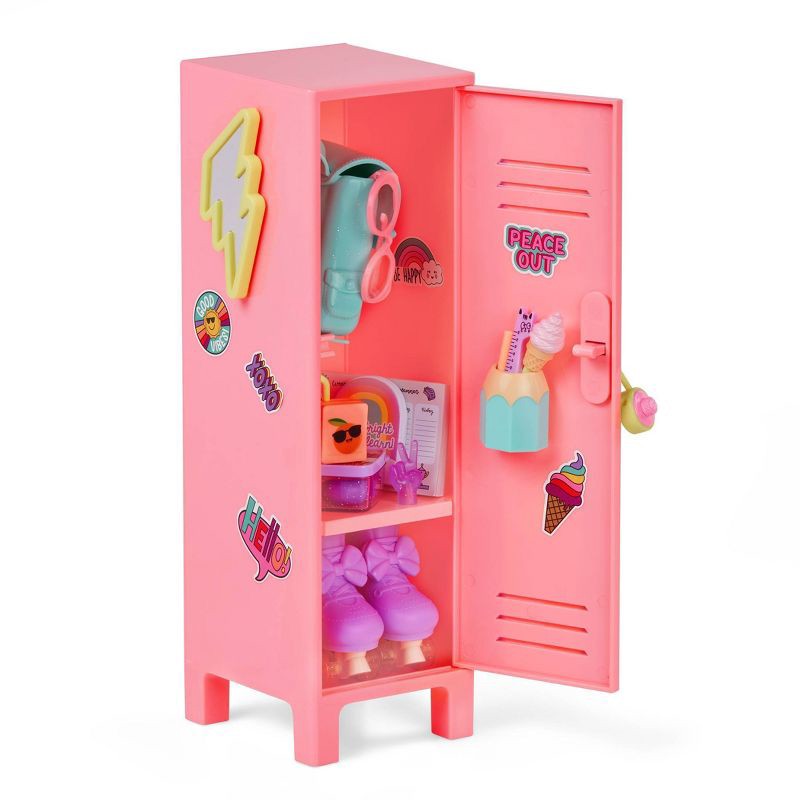 - 25-Piece Set Includes: School doll with 6-piece outfit, a backpack, a locker, a lock, a food container with lid, a stick-on pencil holder, a stick-on mirror, a juice box, a pair of glasses, a toy donut, and a set of mini school accessories.