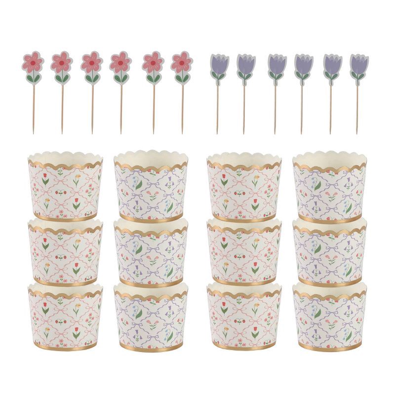 - Paper cupcake liners and decorative pick set with elegant spring floral theme