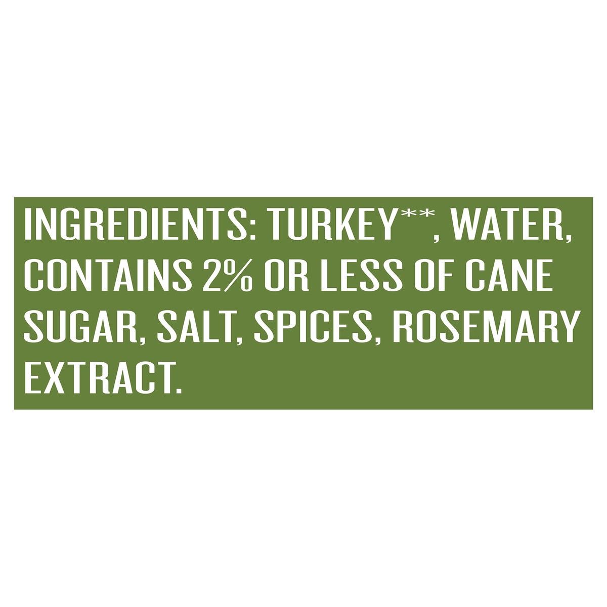 Turkey**, Water, Contains 2% or Less of Cane Sugar, Salt, Spices, Rosemary Extract. ** Turkey never administered antibiotics or animal by-products. Turkey raised on vegetarian feed, on family farms, w…