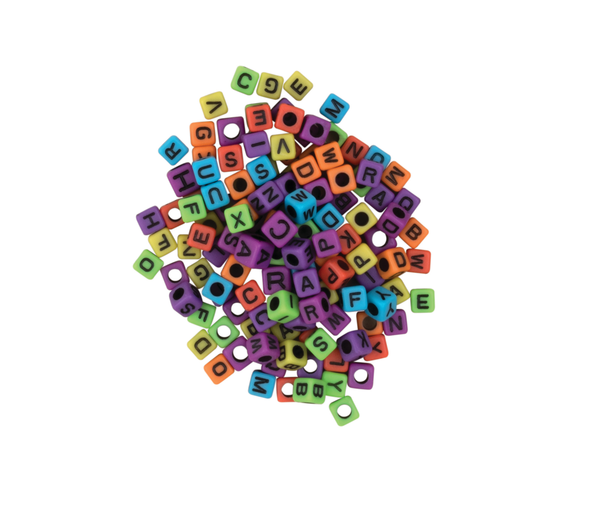 Creativity Street Assorted Rainbow Colored Alphabet Beads are 6mm and have a cubic shape. These plastic beads are sold as 150 per pack and are ideal for personalizing your projects and gifts!