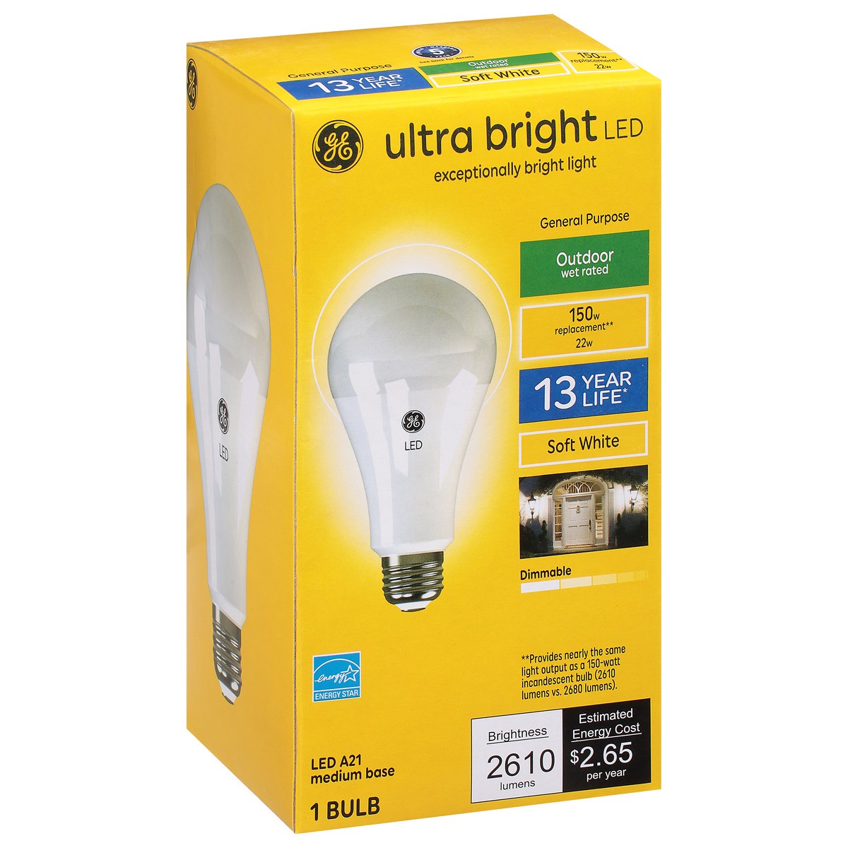 Brightness Quantity: 2610 lumens. Energy Info: $2.65 based on 3 hrs/day, 11¢/kWh. Cost depends on rates and use. 22 watts. Package Info: 1. Voltage: 120 volts. Bulb Info: Outdoor. LED. Is Dimmable. Ha…
