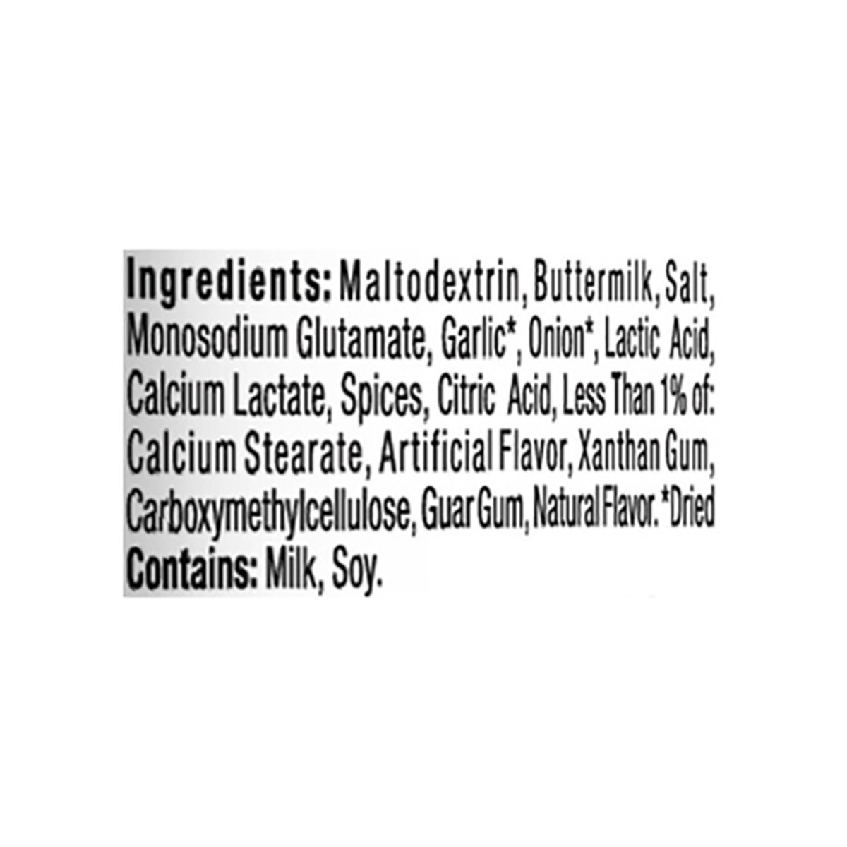 Maltodextrin, Buttermilk, Salt, Monosodium Glutamate, Garlic (Dried), Onion (Dried), Lactic Acid, Calcium Lactate, Spices, Citric Acid, Less than 1% of: Calcium Stearate, Artificial Flavor, Xanthan Gu…