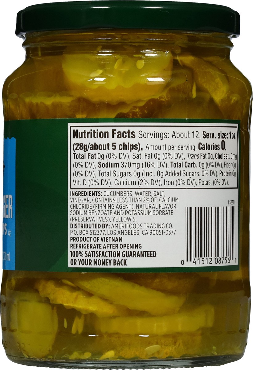 Cucumbers, Water, Salt, Vinegar, Contains Less than 2% of: Calcium Chloride (Firming Agent), Natural Flavor, Sodium Benzoate and Potassium Sorbate (Preservatives), Yellow 5.