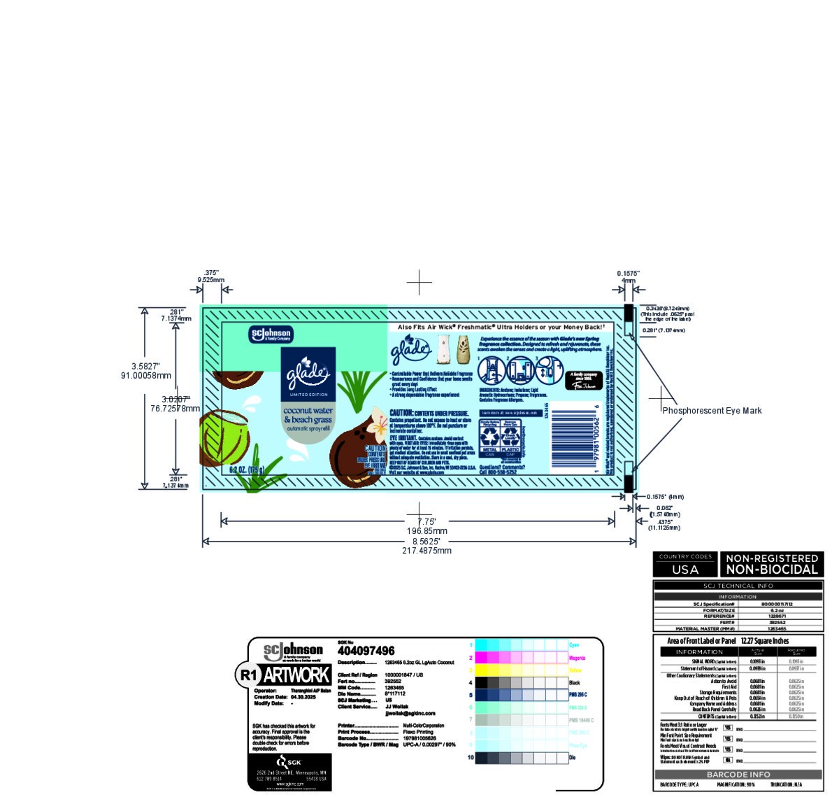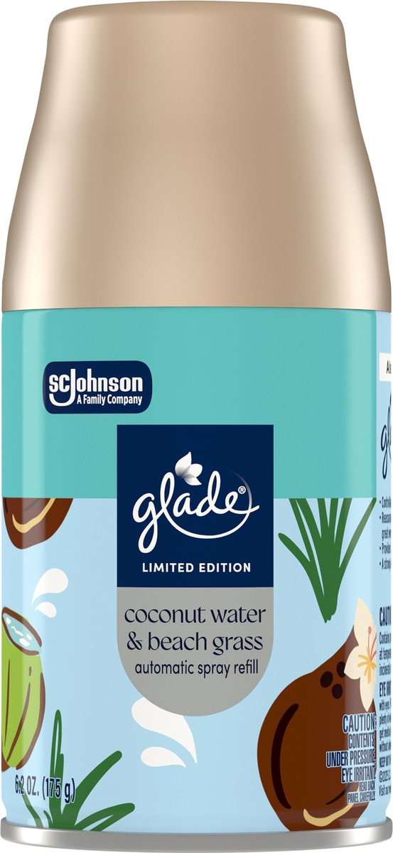 - Includes one Glade Coconut Water & Beach Grass PlugIns Automatic Spray refill infused with bright