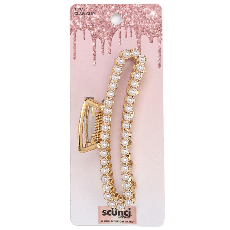 Gather hair, give it a twist, then secure it in a snap with this large claw clip from scunci. The durable gold-tone metal clip has a firm grip, a stylish cut-out center, and rows of festive faux pearl…