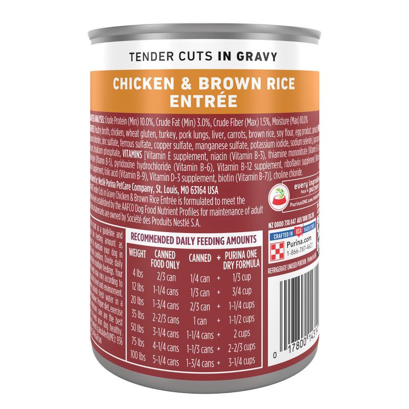 Reward your faithful companion every day with Purina ONE Tender Cuts in Gravy Chicken and Brown Rice canned dog food entree. This dog food wet recipe provides 100 percent nutrition for adult dogs with…