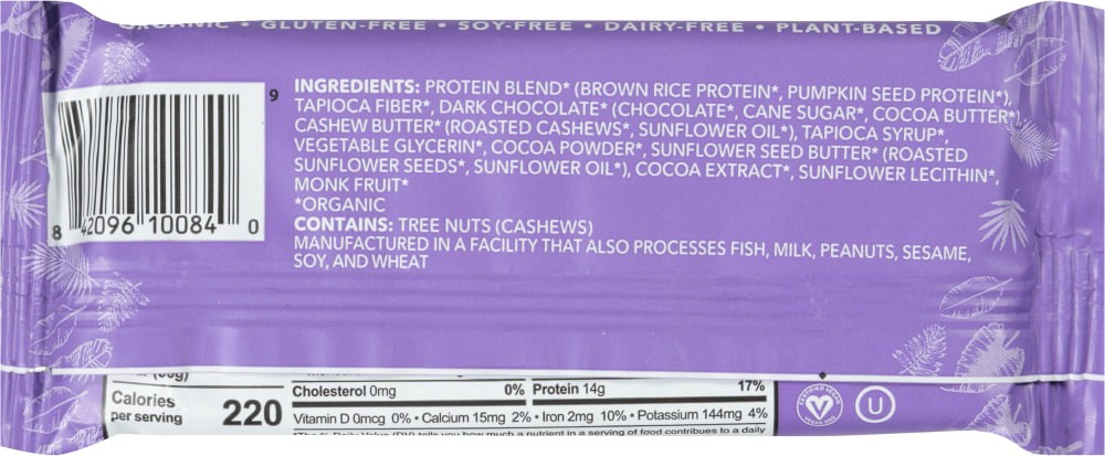 Protein Blend* (Brown Rice Protein*, Pumpkin Seed Protein*), Tapioca Fiber*, Dark Chocolate* (Chocolate*, Cane Sugar*, Cocoa Butter*), Cashew Butter* (Roasted Cashews*, High Oleic Sunflower Oil*), Tap…