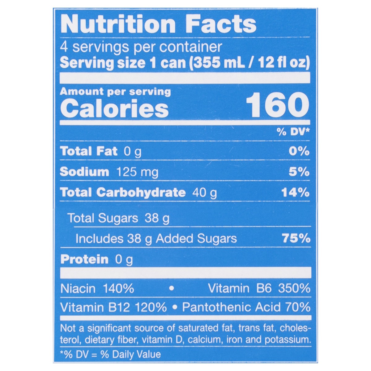Carbonated Water, Sugar, Glucose, Citric Acid, Taurine, Sodium Citrate, Natural and Artificial Flavors, Caffeine, Color, Niacinamide, Pyridoxine Hcl (Vitamin B6), Calcium Pantothenate, Blue 1, Vitamin…