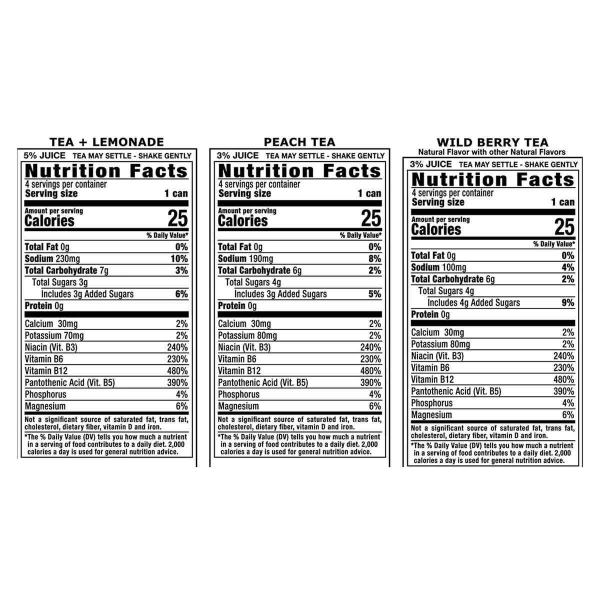 Tea + Lemonade: Brewed Tea (Filtered Water, Black Tea Solids), Glucose, Lemon Juice Concentrate, Taurine, Citric Acid, Sodium Citrate, Panax Ginseng Flavor, Natural Flavors, Magnesium Lactate, Calcium…