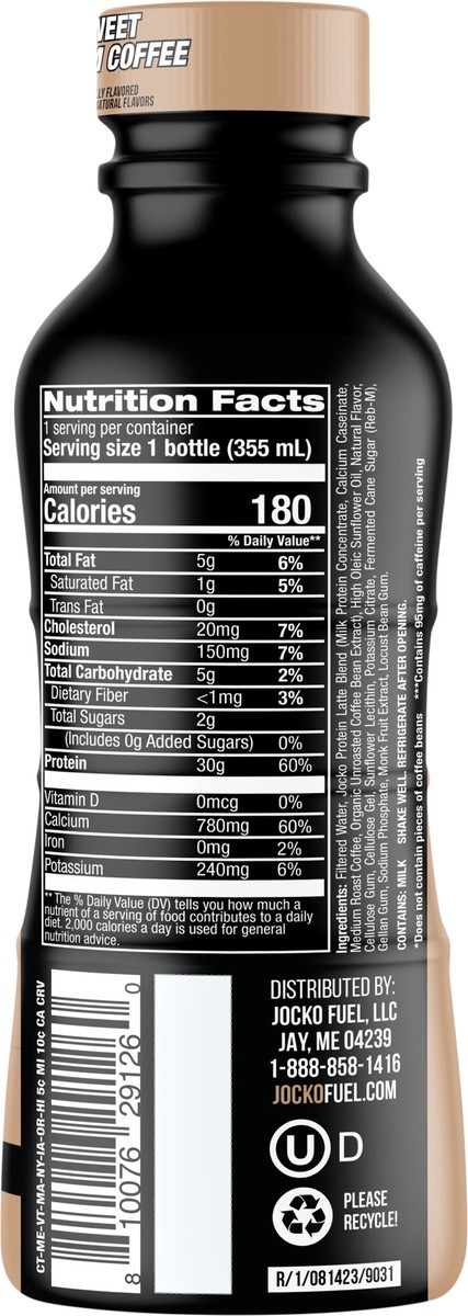 Filtered Water, Jocko Protein Latte Blend (Milk Protein Concentrate, Calcium Caseinate, Medium Roast Coffee, Organic Unroasted Coffee Bean Extract), High Oleic Sunflower Oil, Natural Flavor, Cellulose…