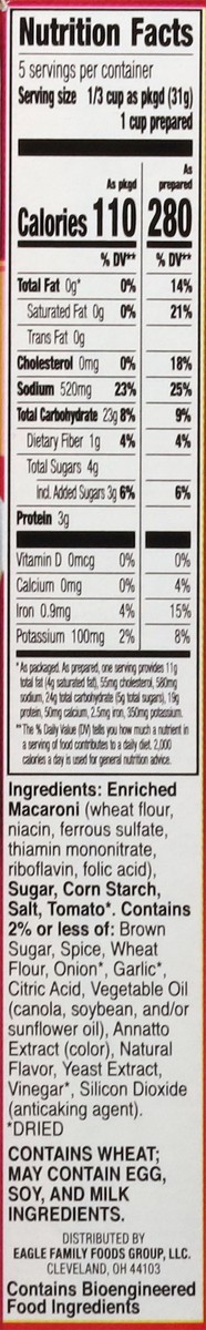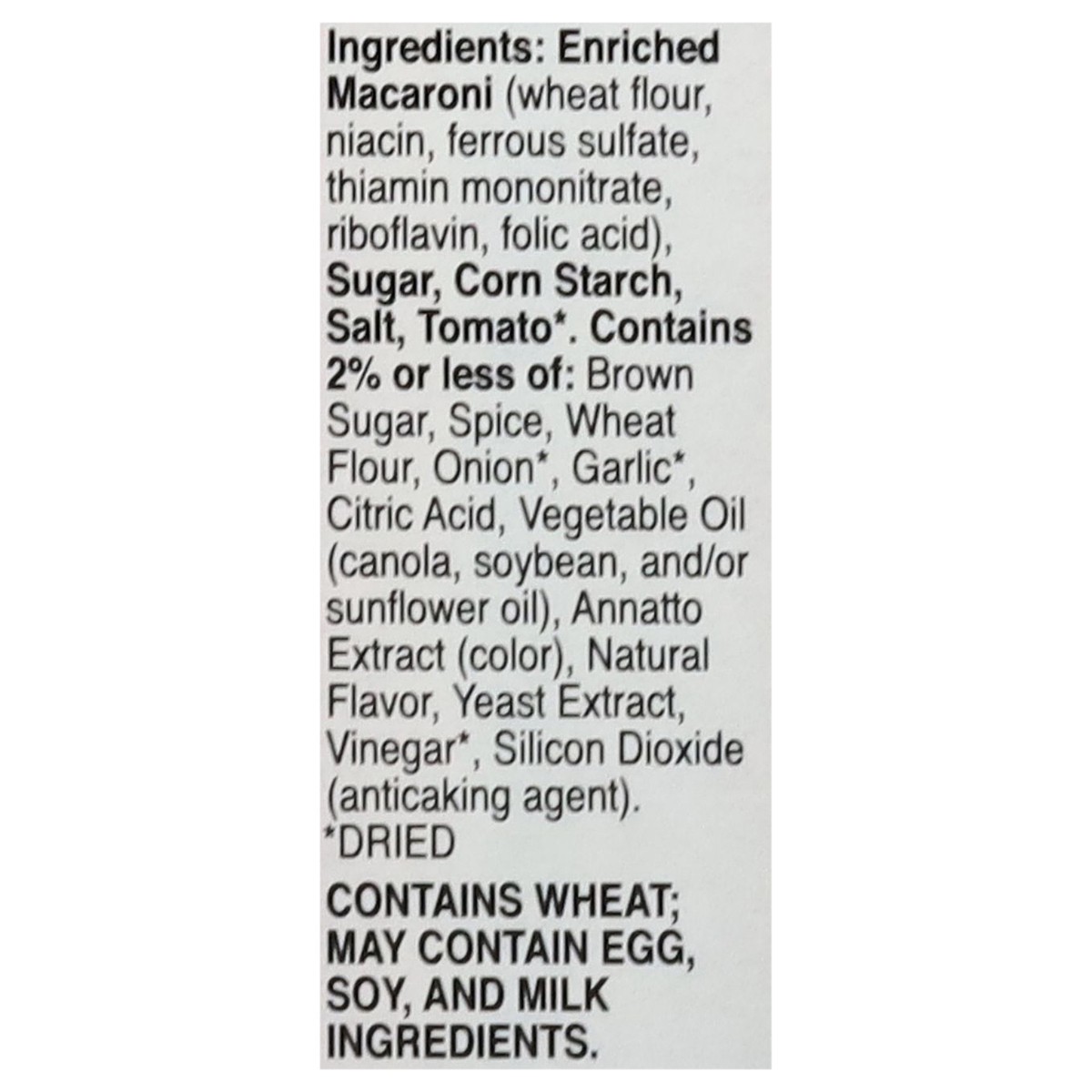Enriched Macaroni (Wheat Flour, Niacin, Ferrous Sulfate, Thiamin Mononitrate, Riboflavin, Folic Acid), Sugar, Corn Starch, Salt, Tomato*. Contains 2% or Less of: Brown Sugar, Spice, Wheat Flour, Onion…