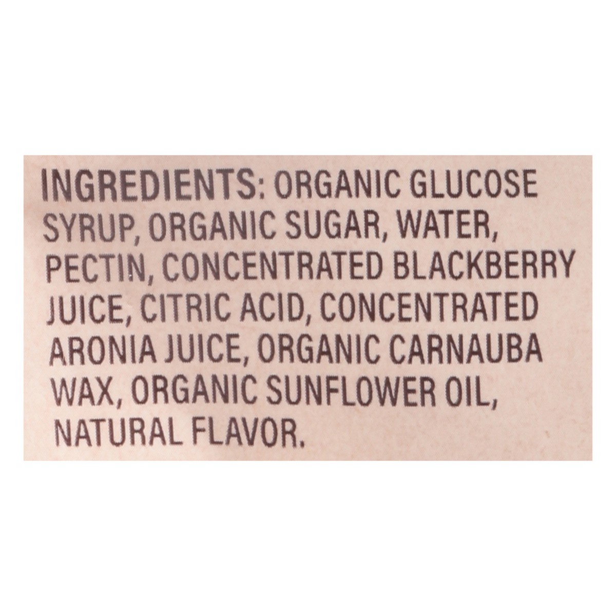 Organic Glucose Syrup, Organic Sugar, Water, Pectin, Concentrated Blackberry Juice, Citric Acid, Concentrated Aronia Juice, Organic Carnauba Wax, Organic Sunflower Oil, Natural Flavor.