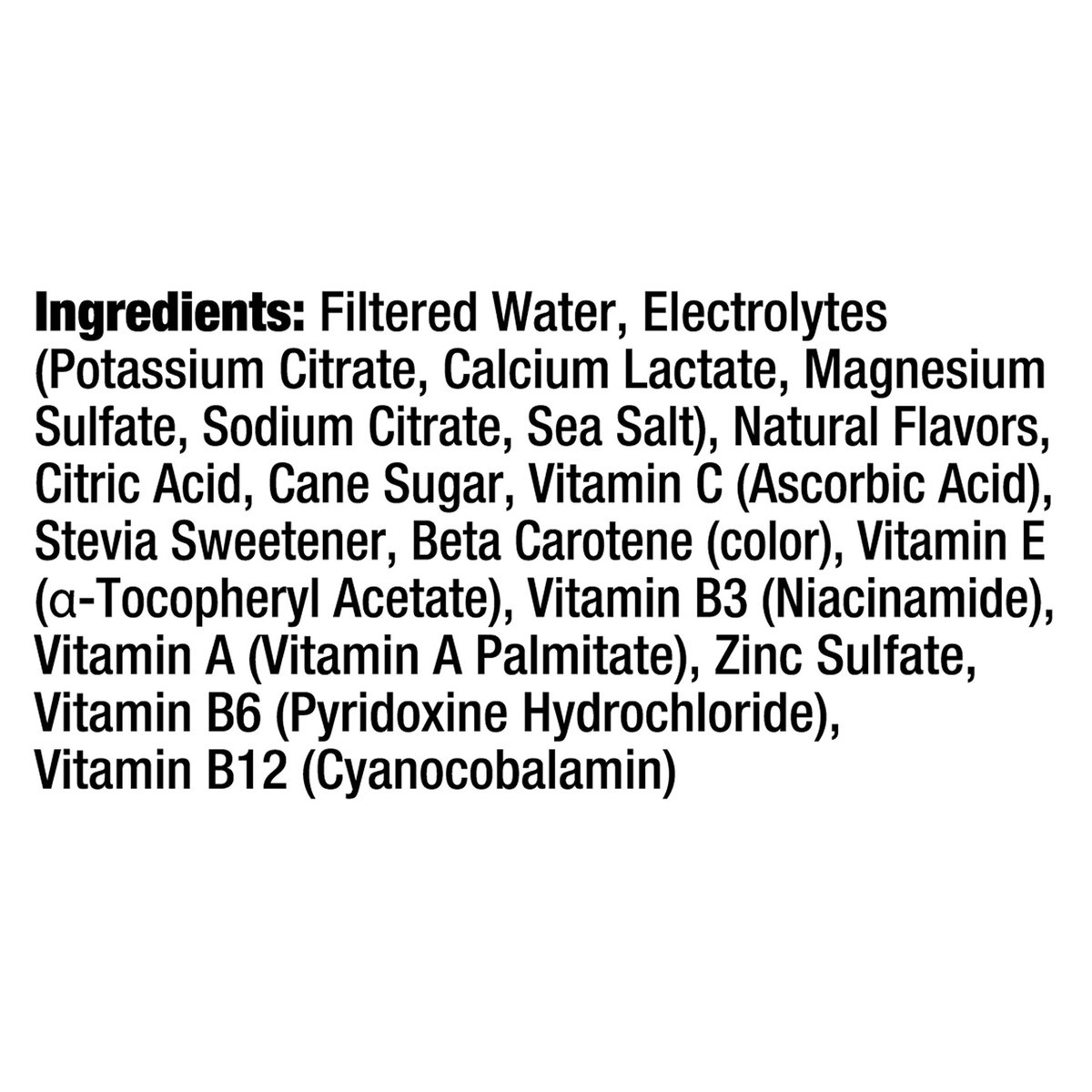 Filtered Water, Electrolytes (Potassium Citrate, Calcium Lactate, Magnesium Sulfate, Sodium Citrate, Sea Salt), Natural Flavors, Citric Acid, Cane Sugar, Vitamin C (Ascorbic Acid), Stevia Sweetener, B…