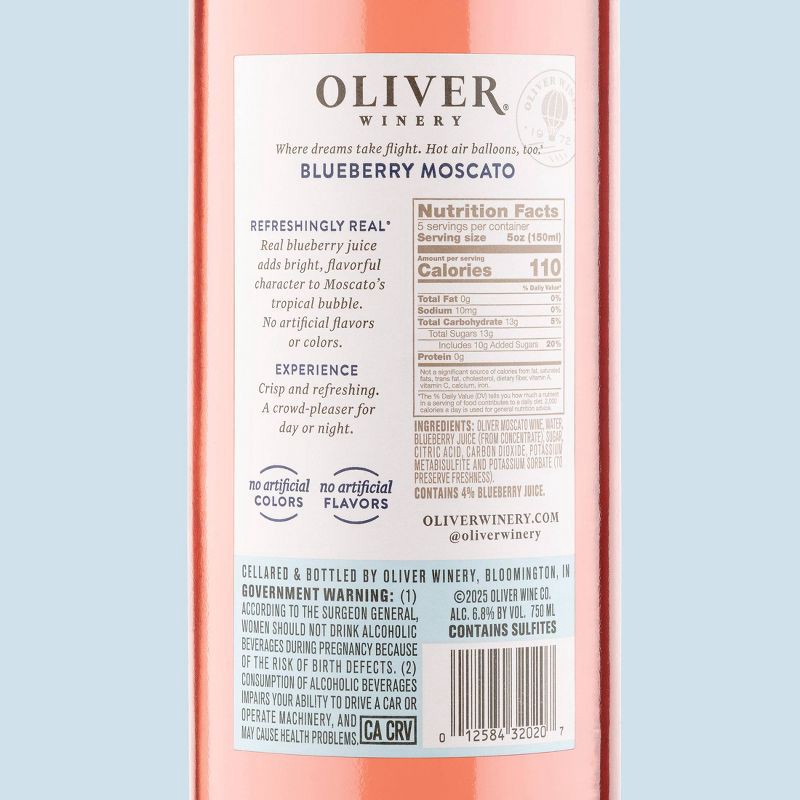 Oliver Moscato Wine, Water, Blueberry Juice (from Concentrate), Sugar, Citric Acid, Carbon Dioxide, Potassium Metabisulfite and Potassium Sorbate (to Preserve Freshness).
