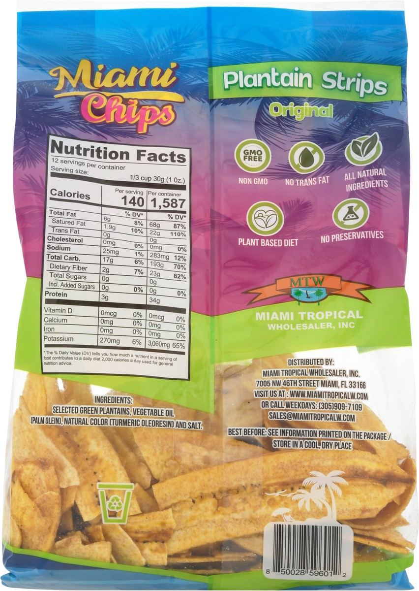 Selected Green Plantains, Vegetable Oil (Palm Olein), Natural Color (Turmeric Oleoresin) and Salt.