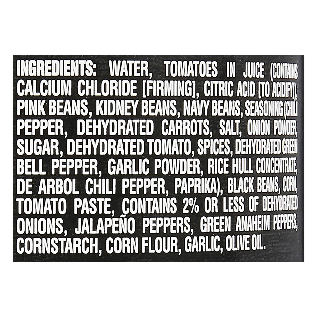 Water, Tomatoes in Juice (Contains Calcium Chloride [Firming], Citric Acid [to Acidify]), Pink Beans, Kidney Beans, Navy Beans, Seasoning (Chili Pepper, Dehydrated Carrots, Salt, Onion Powder, Sugar, …