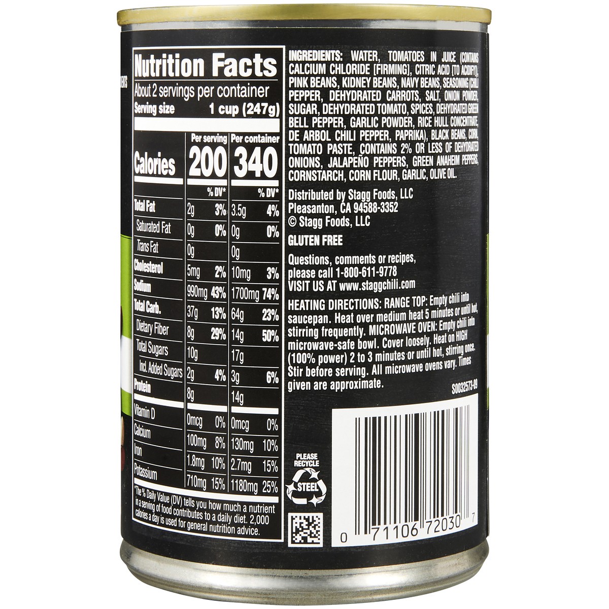 Tomato & bell pepper. Gluten free. 99% fat free. Est. 1956. No artificial ingredients. www.staggchili.com. Questions, comments or recipes, please call 1-800-611-9778. Visit us at www.staggchili.com. P…