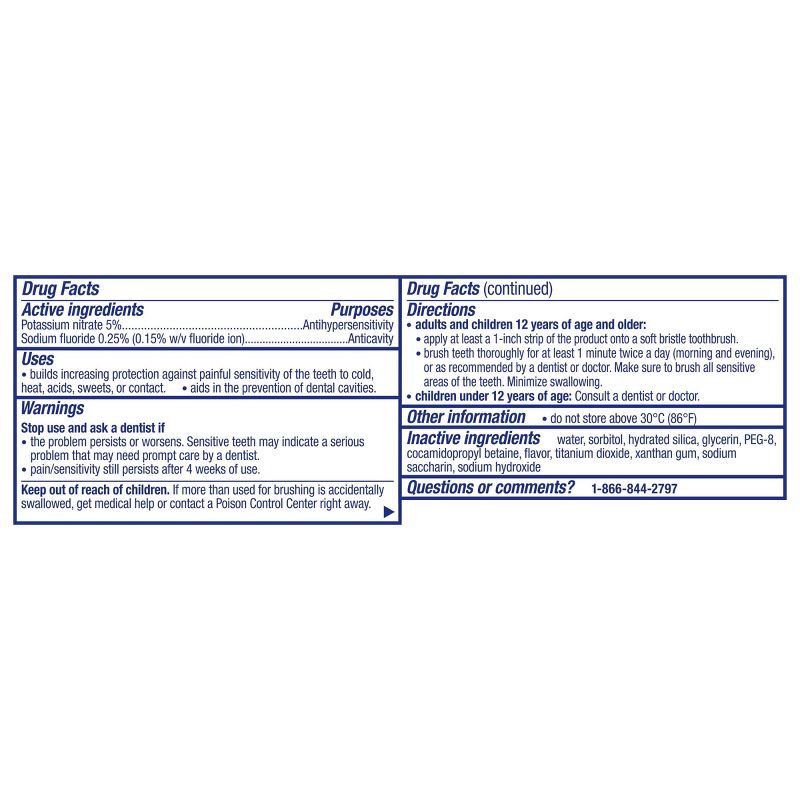Active Ingredients - Purpose:\nPotassium Nitrate 5% - Antihypersensitivity.\nSodium Fluoride 0.15% w/v Fluoride Ion - Anticavity.\nInactive Ingredients: Water, Sorbitol, Hydrated Silica, Glycerin, PEG…