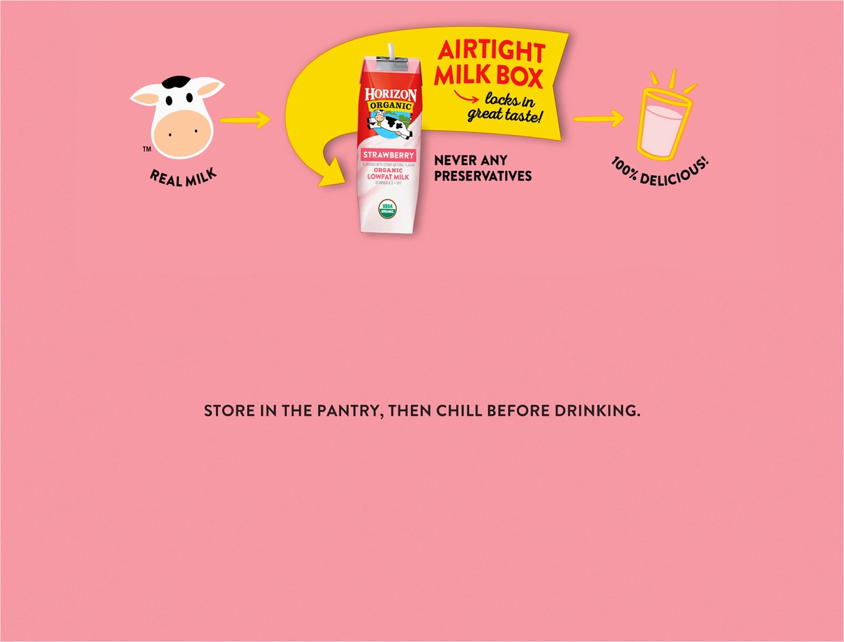 Take the organic goodness of Horizon milk on-the-go with Horizon Organic Shelf Stable 1 Percent Strawberry Milk Boxes. Featuring natural strawberry flavor and real Horizon Organic Milk from pasture-ra…