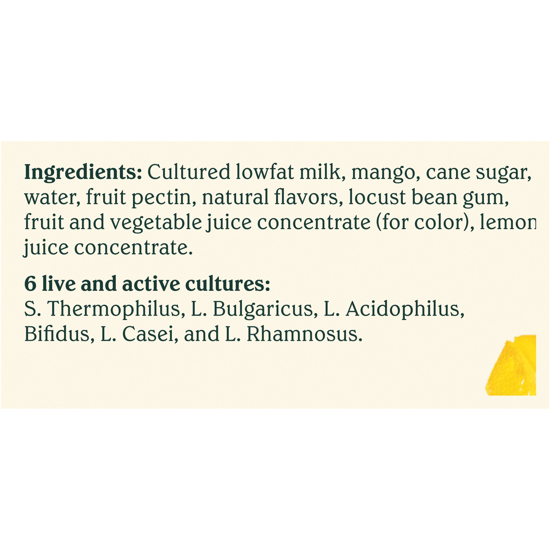 Cultured Reduced Fat Milk, Mangoes, Cane Sugar, Water, Fruit Pectin, Natural Flavors, Guar Gum, Locust Bean Gum, Lemon Juice Concentrate. 6 Live and Active Cultures: S. Thermophilus, L. Bulgaricus, L.…