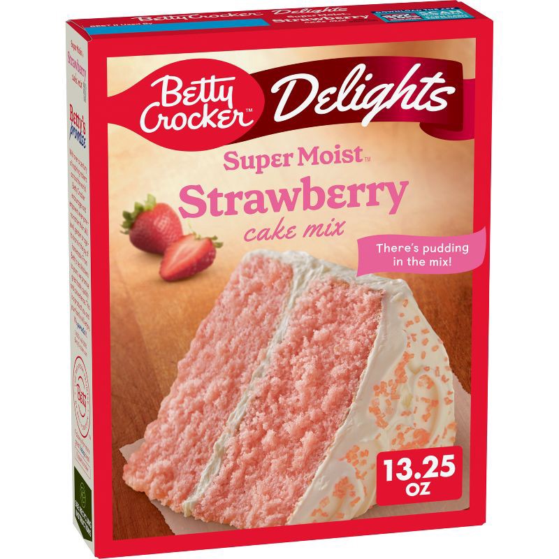 - CONTAINS: One 13.25 oz box of Betty Crocker Delights Super Moist Strawberry Flavored Cake Mix