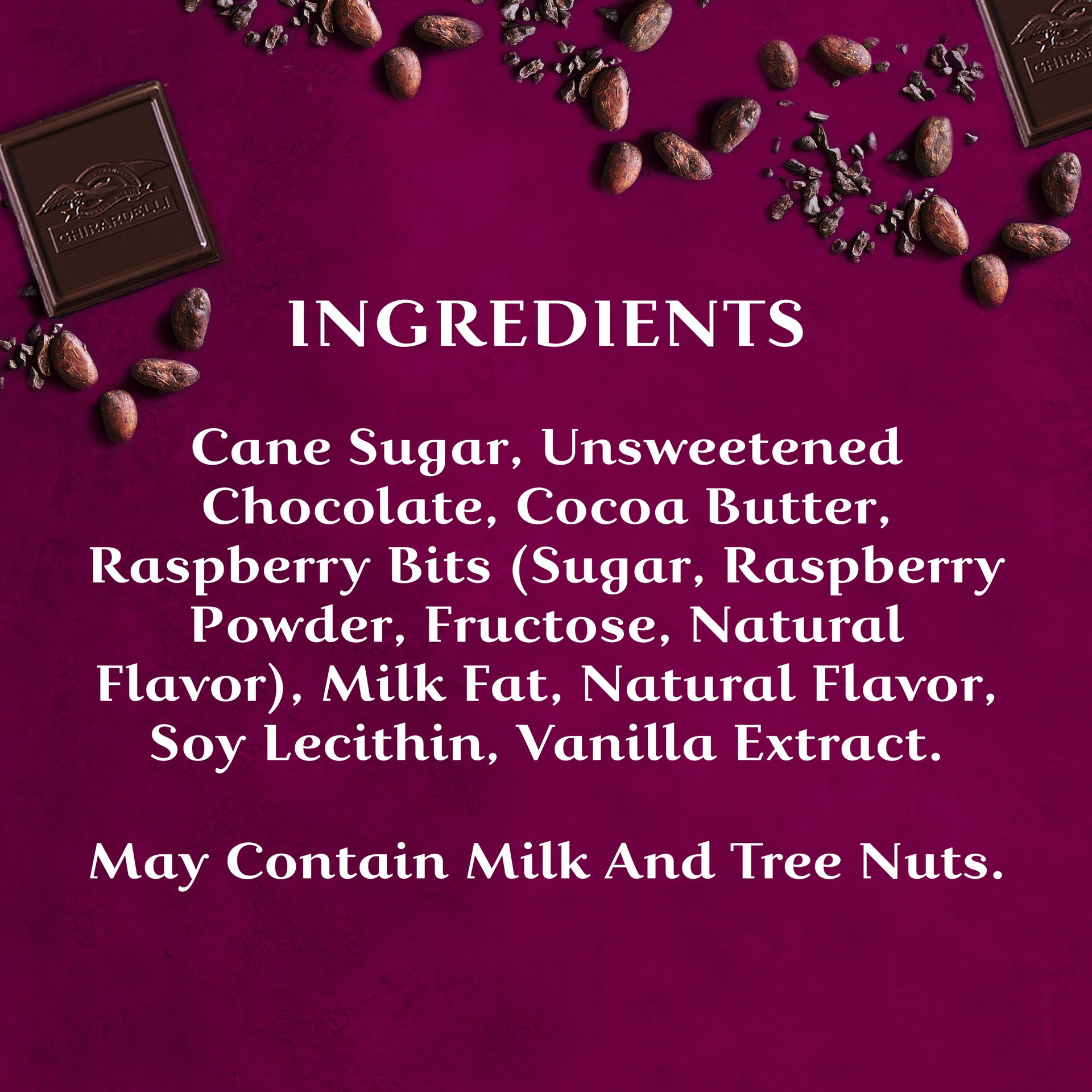 Ingredients: Cane sugar, unsweetened chocolate, cocoa butter, raspberry bits (sugar, raspberry powder, fructose, natural flavor), milk fat, natural flavor, soy lecithin, vanilla extract.