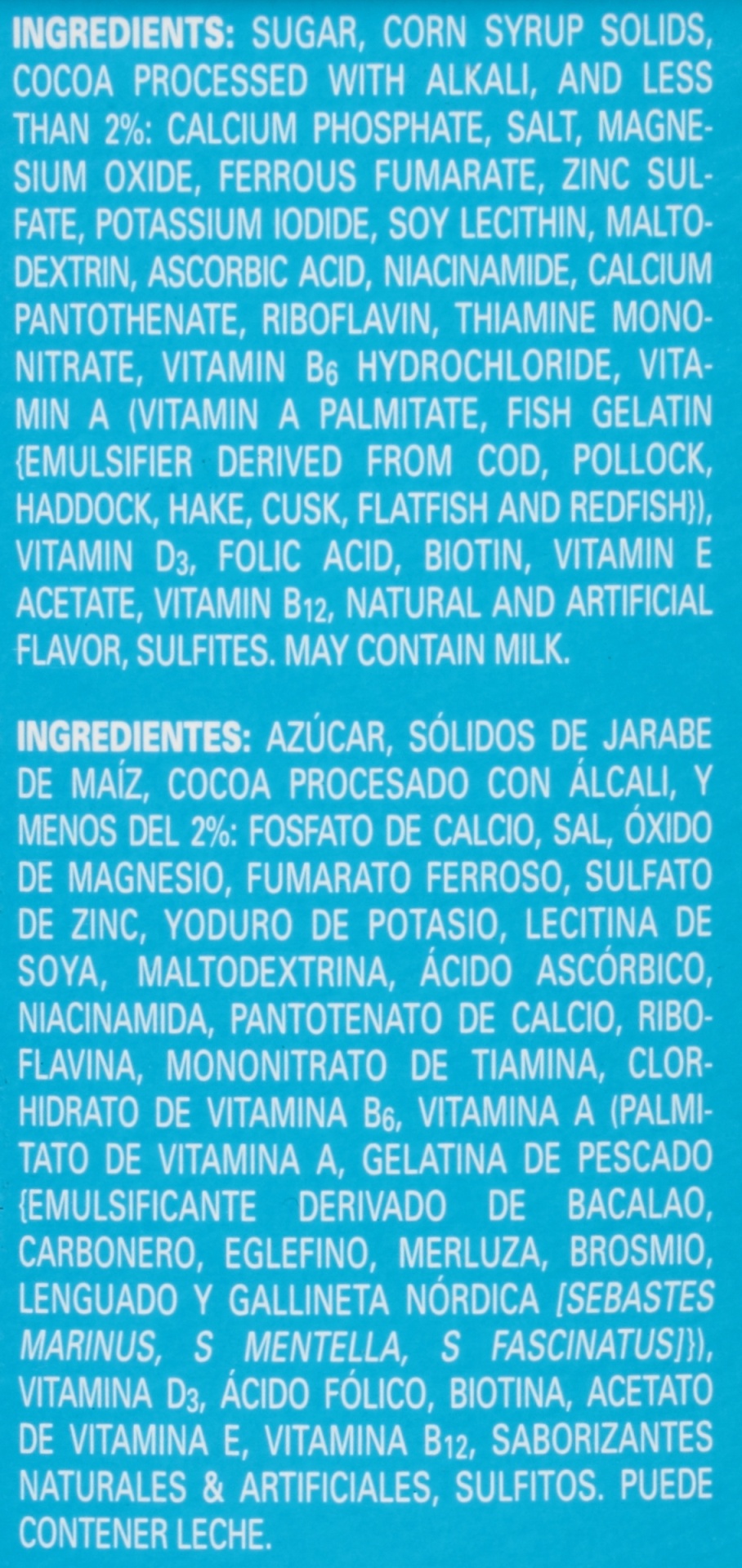 Sugar, Corn Syrup Solids, Cocoa Processed with Alkali, and Less than 2%: Calcium Phosphate, Salt, Magnesium Oxide, Ferrous Fumarate, Zinc Sulfate, Potassium Iodide, Soy Lecithin, Maltodextrin, Ascorbi…