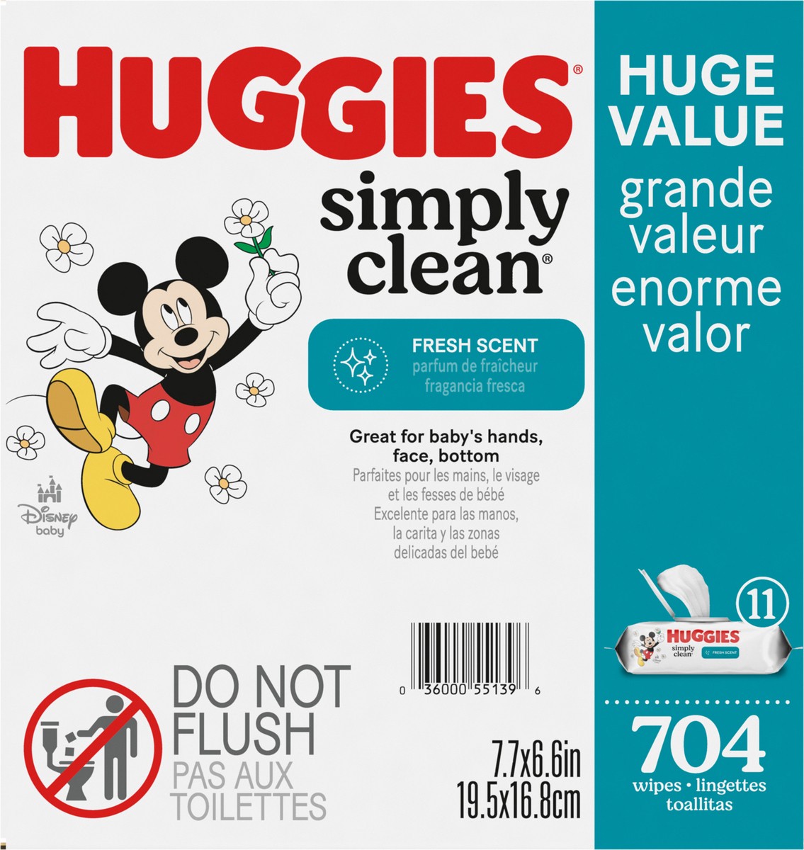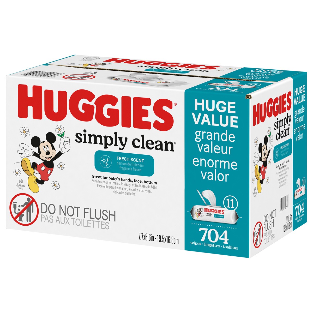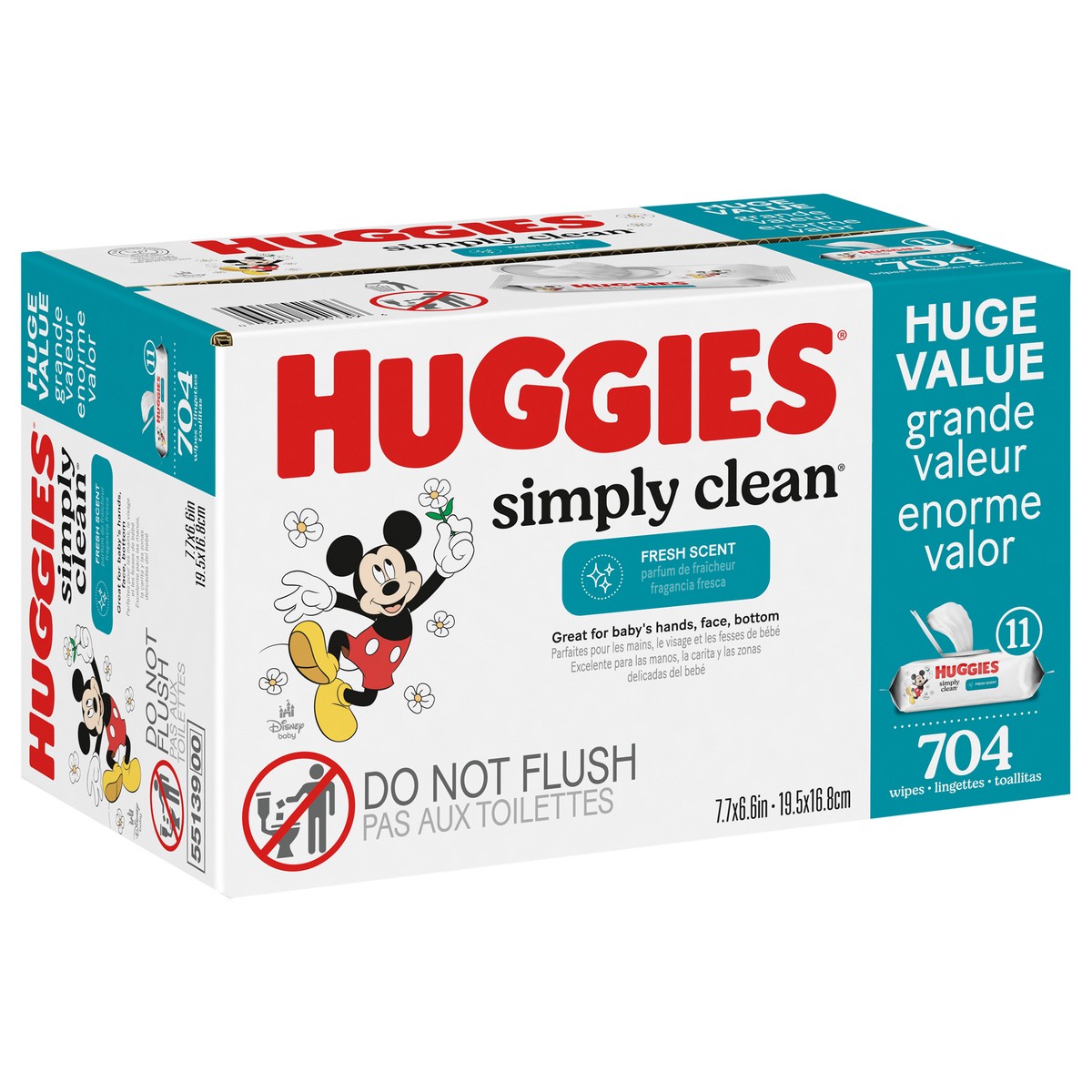 - Huggies Simply Clean Fresh Scent Baby Wipes: 11 flip-top packs of 64 scented baby wipes (704 wipes total)