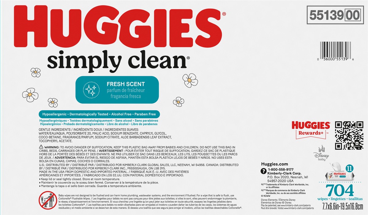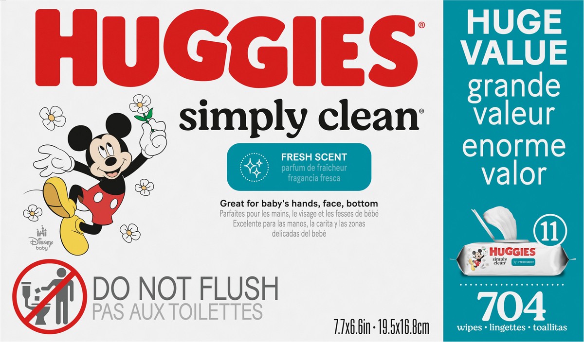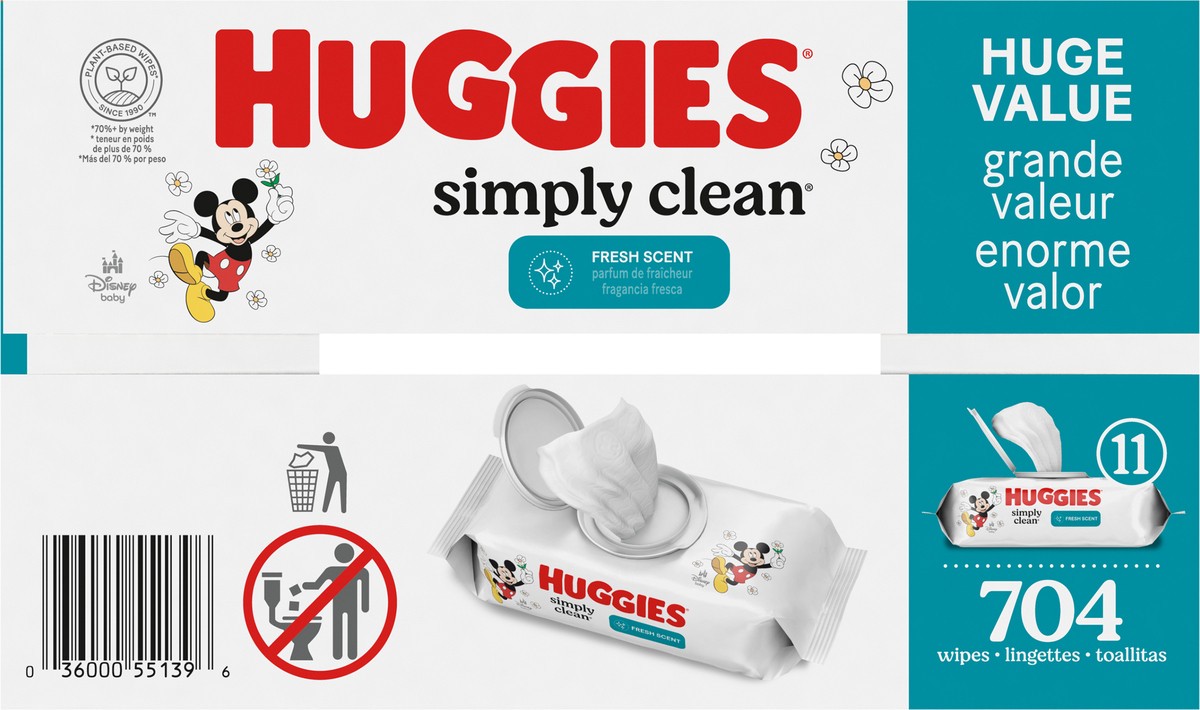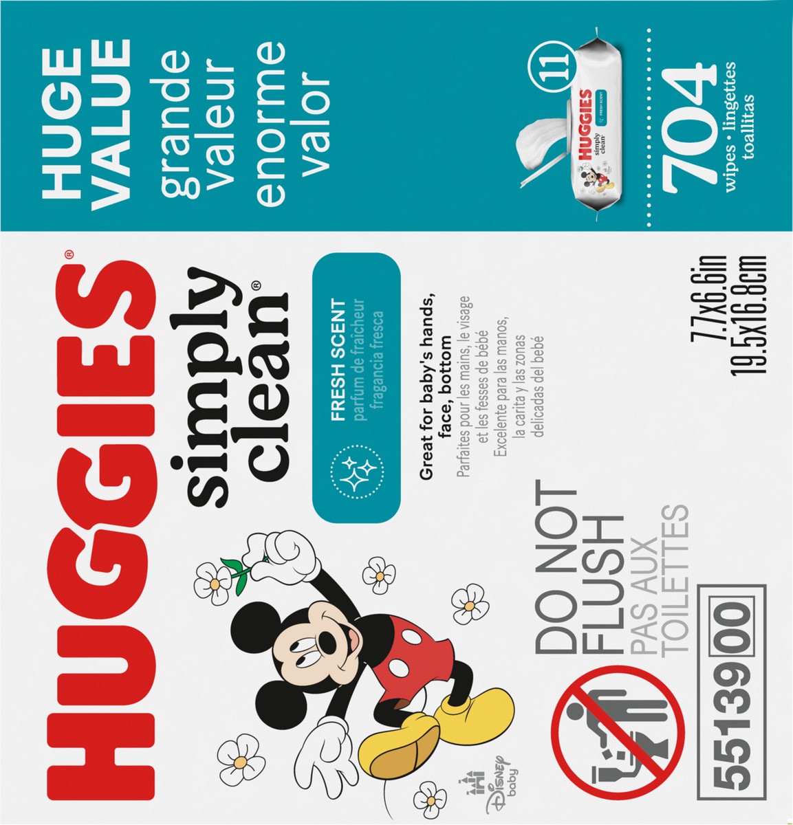 - Huggies Simply Clean Fresh Scent Baby Wipes: 11 flip-top packs of 64 scented baby wipes (704 wipes total)