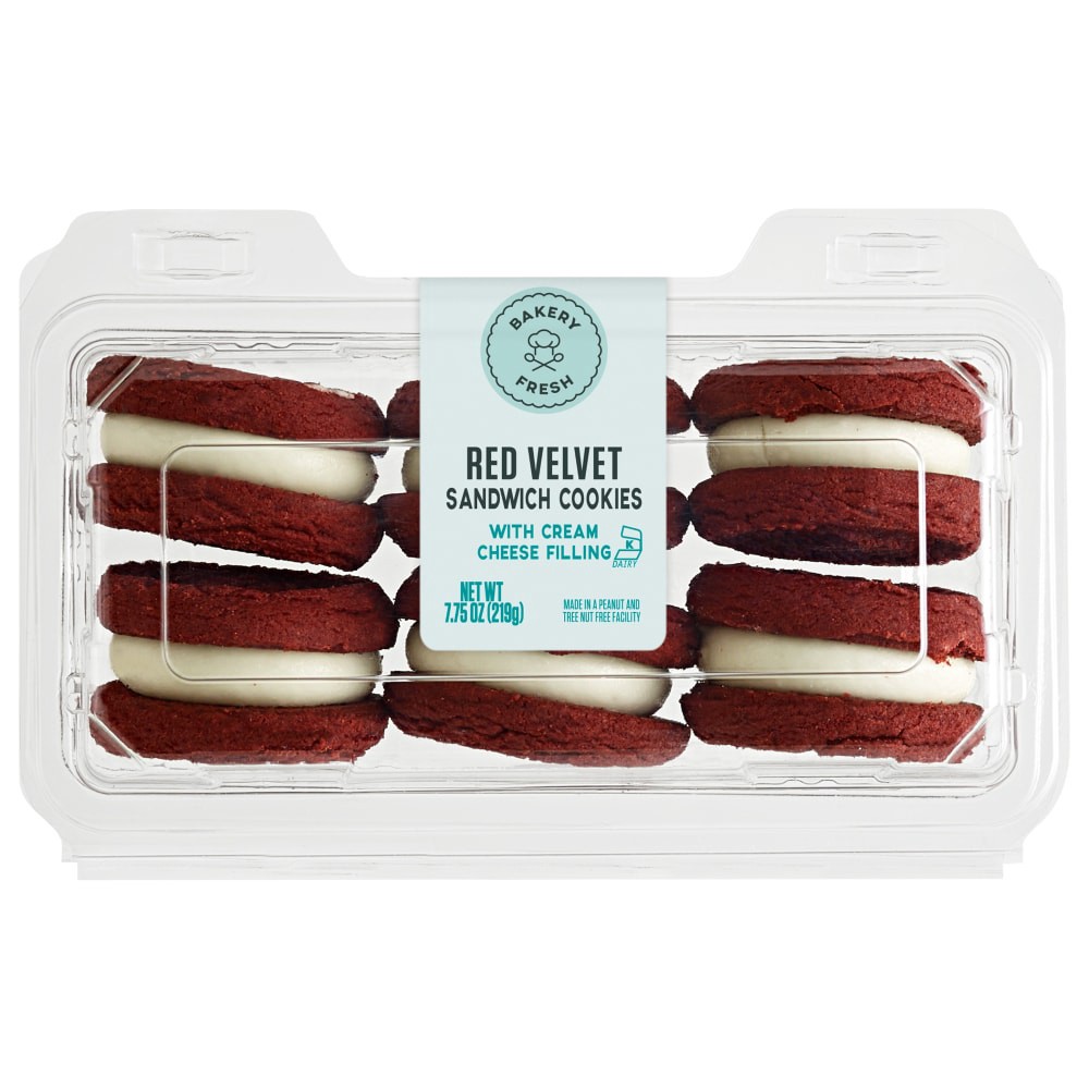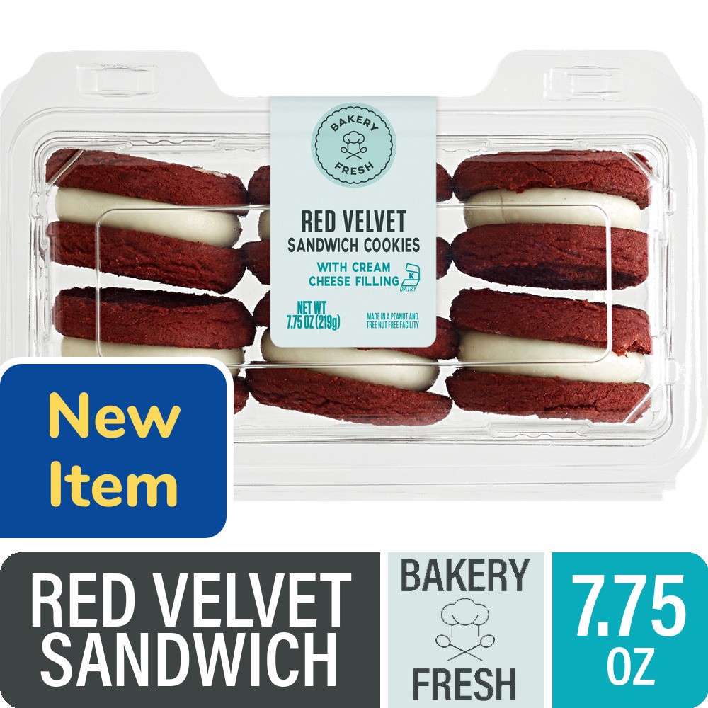 Bakery Fresh Red Velvet Sandwich Cookies are delicious delights everyone will love. Enjoy the light, fluffy red velvet cake cookies with rich cream cheese filled center. They're great for a special sn…