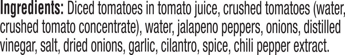 INGREDIENTS: DICED TOMATOES IN TOMATO JUICE, CRUSHED TOMATOES (WATER, CRUSHED TOMATO CONCENTRATE), WATER, JALAPENO PEPPERS, ONIONS, DISTILLED VINEGAR, SALT, DRIED ONIONS, GARLIC, CILANTRO, SPICE, CHIL…
