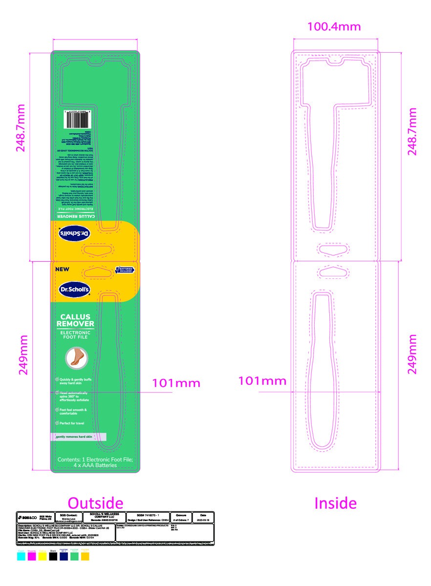 Content: 1 electronic foot file; 4 X AAA batteries. New. Callus remover electronic foot file. Quickly & gently buffs away hard skin head automatically spins 360 degrees to effortlessly exfoliate. Feet…