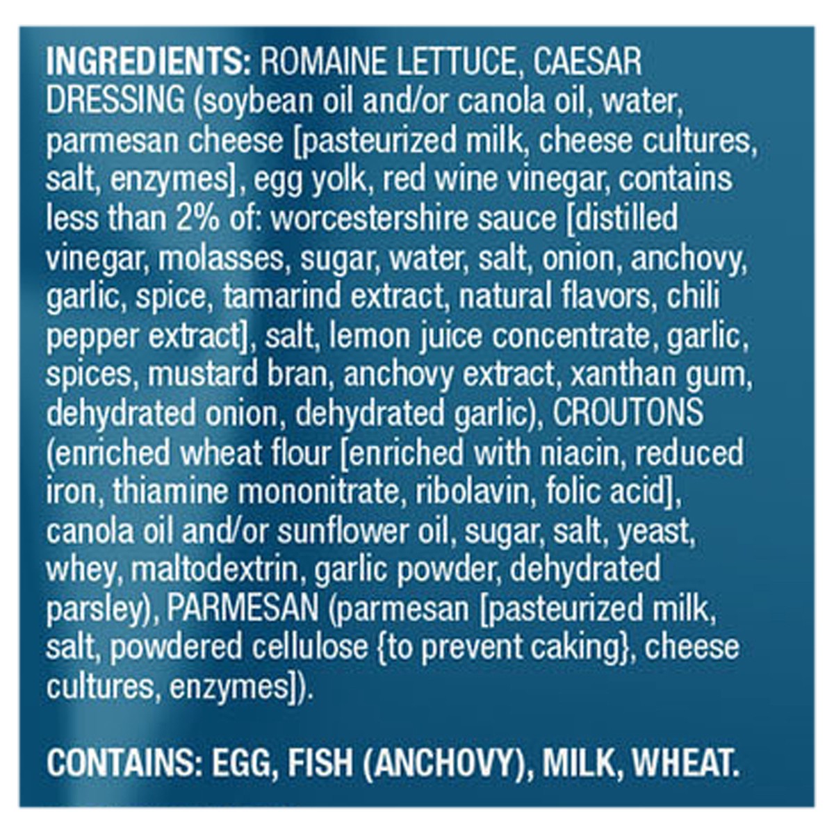 Romaine Lettuce, Caesar Dressing (Soybean Oil and/or Canola Oil, Water, Parmesan Cheese [Pasteurized Milk, Cheese Cultures, Salt, Enzymes], Egg Yolk, Red Wine Vinegar, Contains Less than 2% of: Worces…