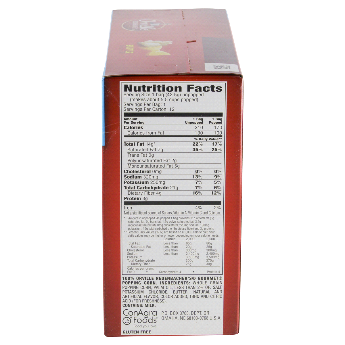 Whole Grain Popping Corn, Palm Oil, Salt, Butter, Color Added (Annatto, Turmeric, Paprika), Natural Flavors, Mixed Tocopherols (Vitamin E for Freshness).