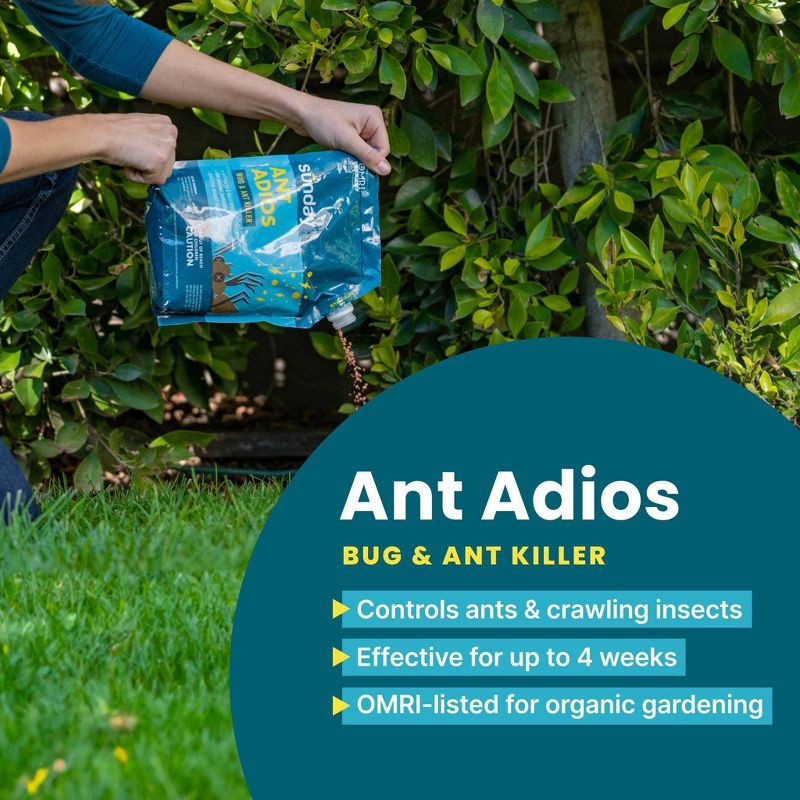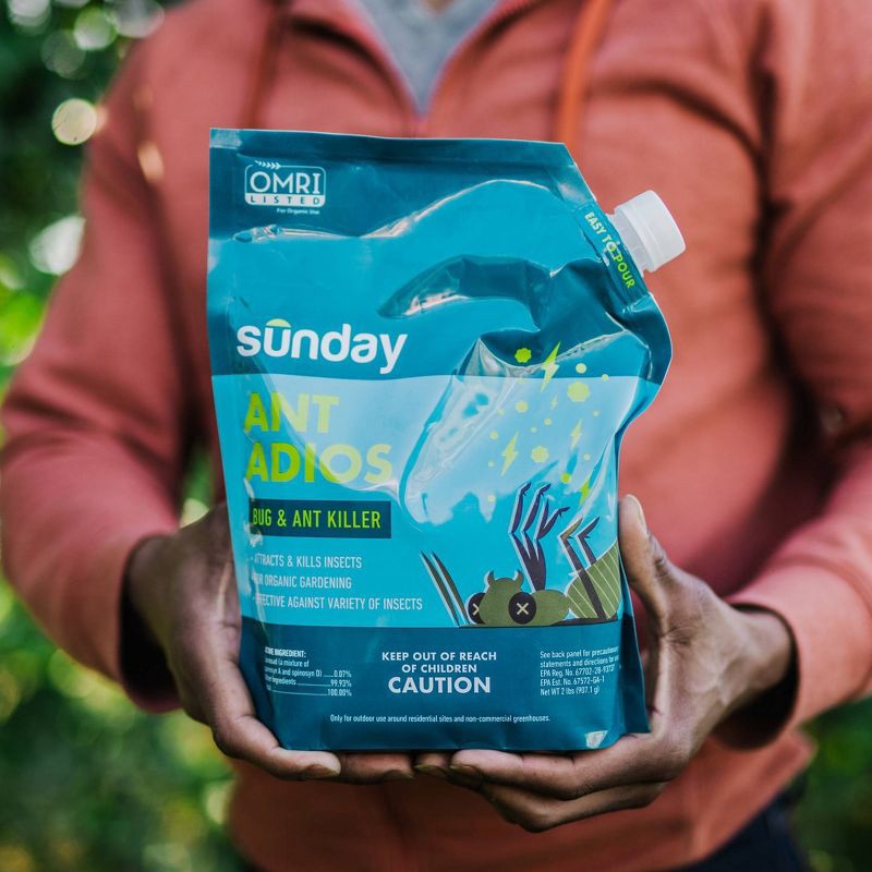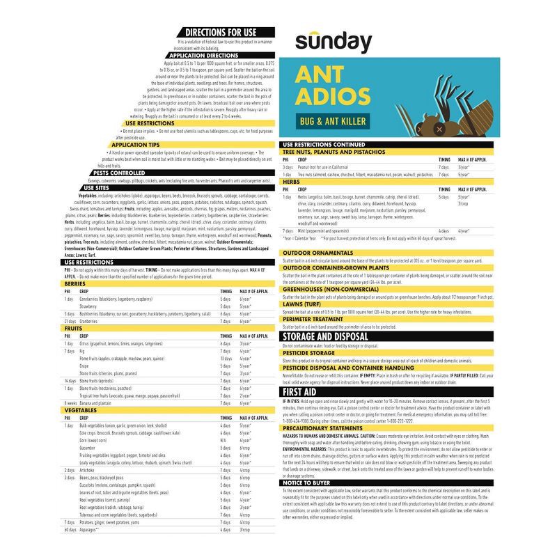 Sunday Ant Adios 4,000 Sq. Ft. Insect & Ant Killer 2 lbs. Sunday's Ant Adios is a powerful, biologically-derived solution to eliminate ants and a variety of insects in outdoor spaces. Containing the a…