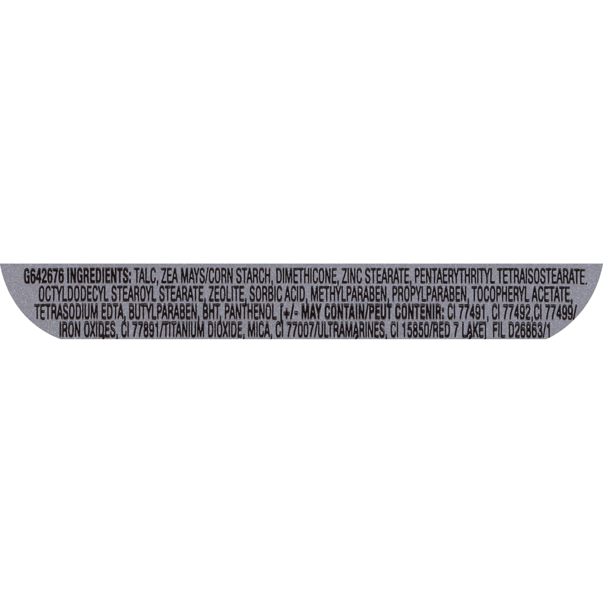 Talc, Dimethicone, Nylon-12, Polymethylsilsesquioxane, Cetyl Dimethicone, Magnesium Stearate Trimethylsiloxysilicate, Phenoxyethanol, Methylparaben, Silica, Ethylparaben, Propylparaben, Isobutylparabe…